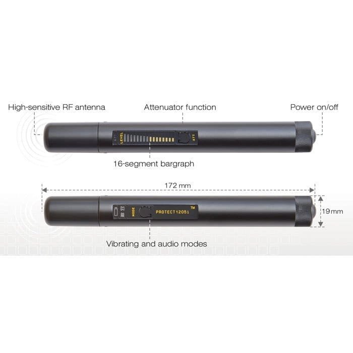 The iProtect RF detection wand, easily fits in user hand to conceal action while sweeping for bugs of different types. Perfect fit for both professional and novice users, simple to use, and allows operator to locate the source. Keep your conversations to yourself with the RF Detector wand.